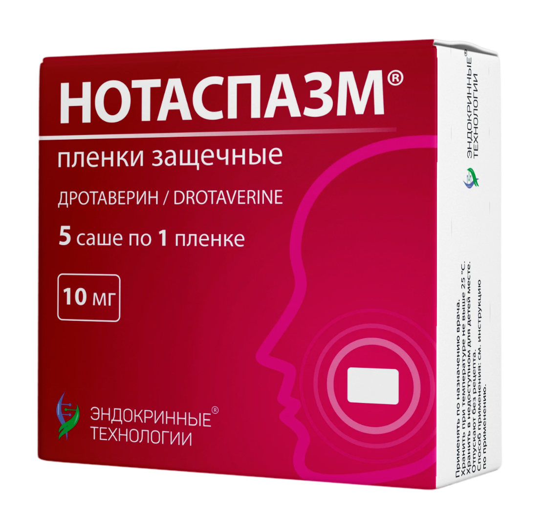 Действующее вещество препарата — дротаверин — расслабляет гладкую мускулатуру и улучшает кровоснабжение тканей. В форме быстрорастворимой защёчной плёнки Нотаспазм® начинает действовать быстрее обычных таблеток: вещество всасывается через слизистую рта и сразу попадает в кровоток, минуя желудок. Это обеспечивает быстрый эффект и снижает нагрузку на ЖКТ.